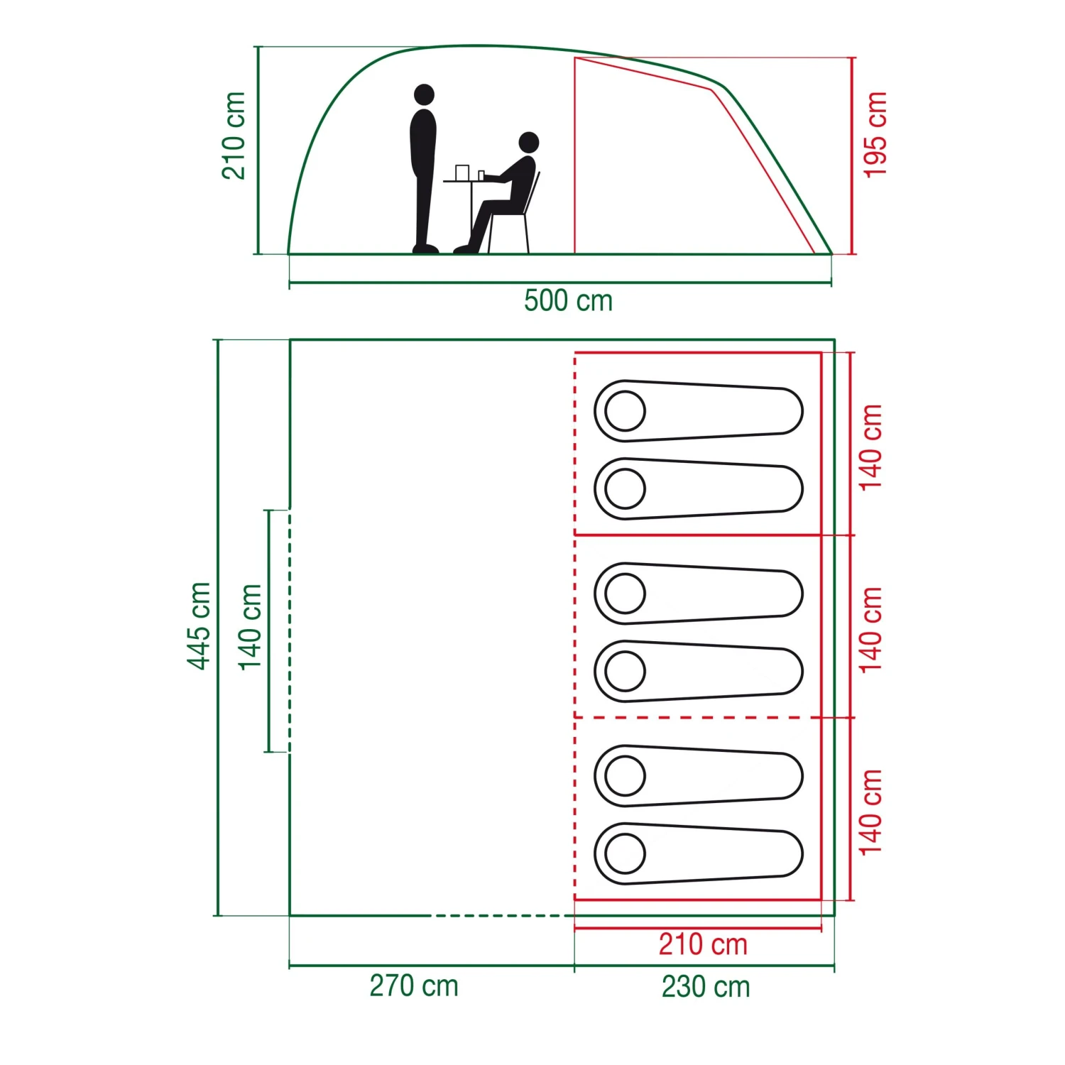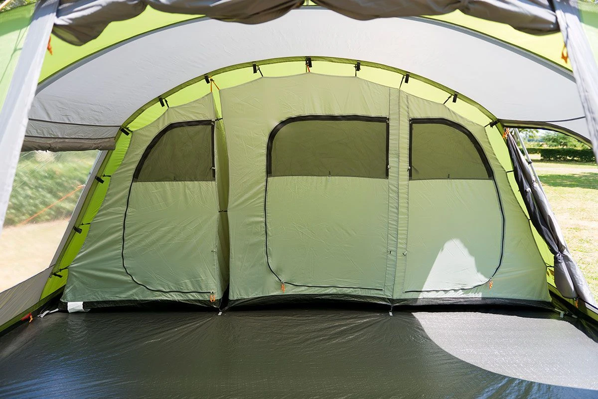 De tent heeft een breedte van 4,5 meter, waardoor er voldoende ruimte is om een tafel en zes stoelen te plaatsen. De Vespucci 6 beschikt over twee ingangen: een brede deur aan de voorzijde en een handige zijdeur, wat zorgt voor gemakkelijke toegang en extra gebruiksgemak. De slaapcabines zijn ruim en bieden voldoende plaats voor twee luchtbedden of een dubbel luchtbed per cabine. De grotere slaapcabine kan door middel van een ritsbare scheidingswand opgedeeld worden in twee kleinere cabines.