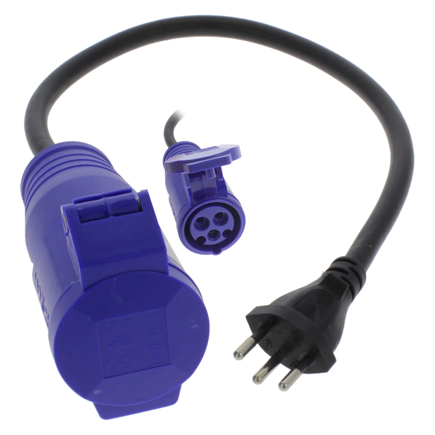 Met deze verloopstekker kun je de CEE kabel van je caravan of camper ook gebruiken in Zwitserland.