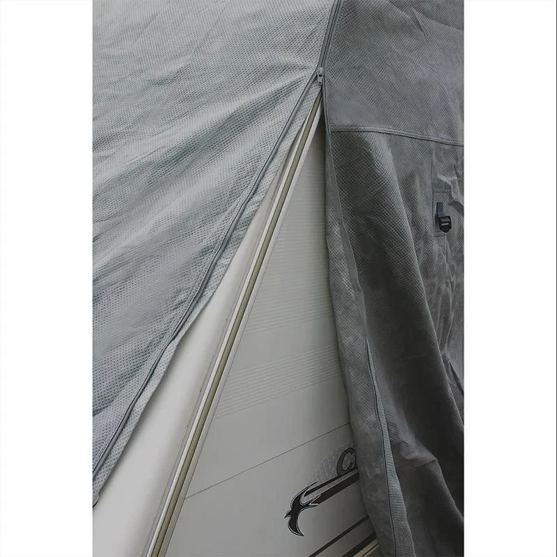 De hoes is ademend en geschikt voor zowel binnen- als buitengebruik en vermindert de kans op schimmel. Je caravan blijft goed beschermt tegen regen, sneeuw, stof en vuil doordat de hoes waterdicht en uv-bestendig is. Met de beveiligingsriemen aan de zijkant blijft de hoes veilig op zijn plaats en met de elastische band heb je een goede pasvorm. Met de zijritssluitingen bij openingen aan beide zijden zorgen voor eenvoudige toegang tot de caravan. De hoes is geschikt voor caravans met een max. breedte van 250 cm en hoogte van 220 cm. De beveiligingsbanden 4 zijn gemaakt van Polypropeen.