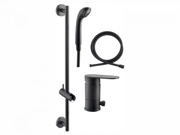 De Reich Linnea doucheset is zwart van kleur en bestaat uit verschillende producten zoals een douchekop, mengkraan, wandstang en een doucheslang.