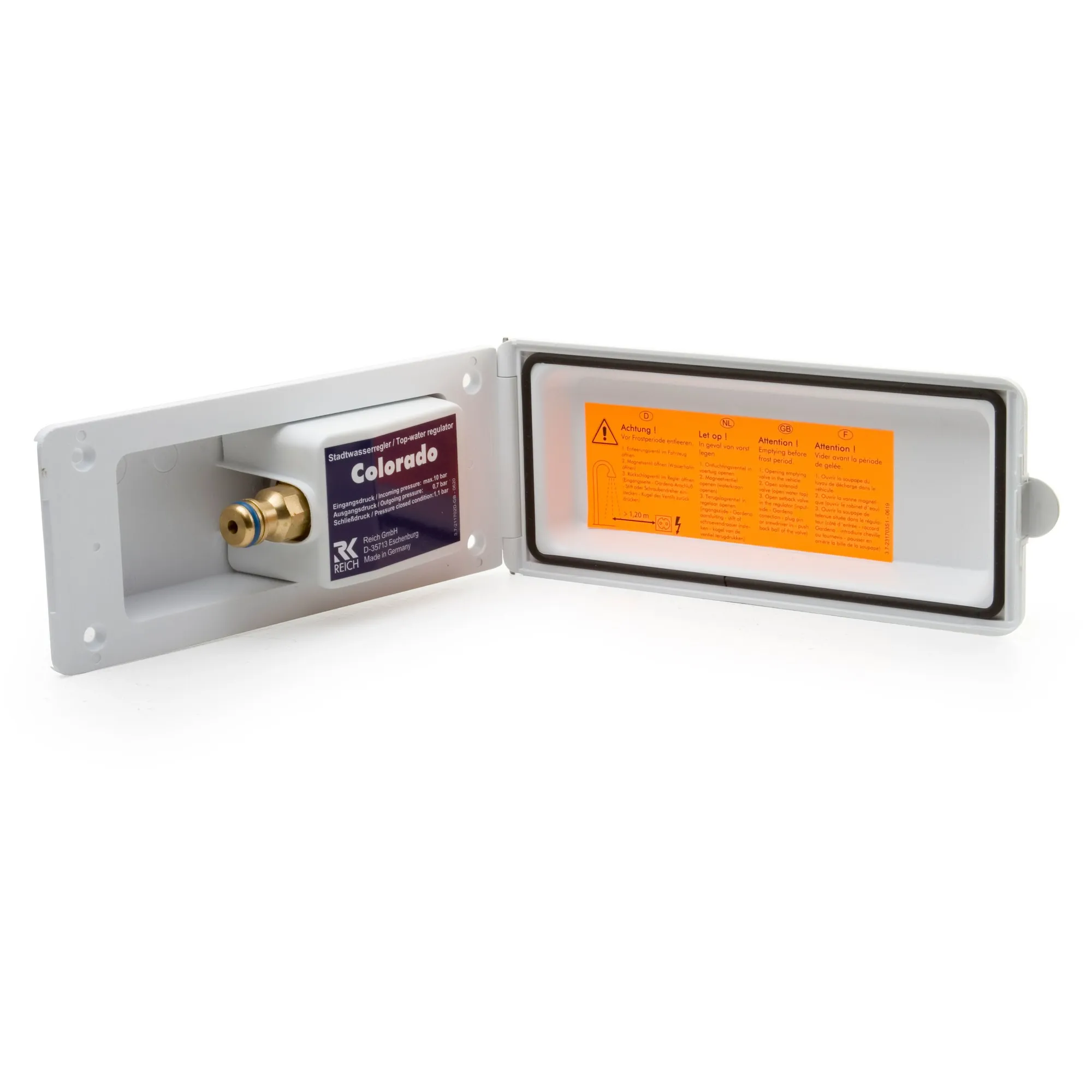 Deze verzorgingskast van Reich is een buitenwandaansluiting om de caravan of camper direct aan te sluiten op het waterleidingnet.