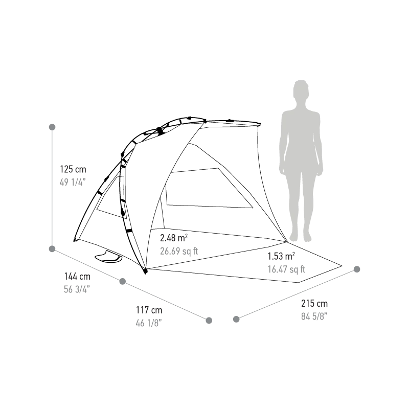 Met afmetingen van 215×144+117 (met uitgerolde vloer)x125 cm (LxBxH), biedt onze strandtent genoeg ruimte en comfort voor jouw zomerse uitjes. De tent is niet alleen ruim, maar ook duurzaam, voorzien van UPF 50+ bescherming en bestand tegen wind tot 7 Bf, zodat je goed beschermd bent tegen UV-stralen en onverwachte windvlagen.